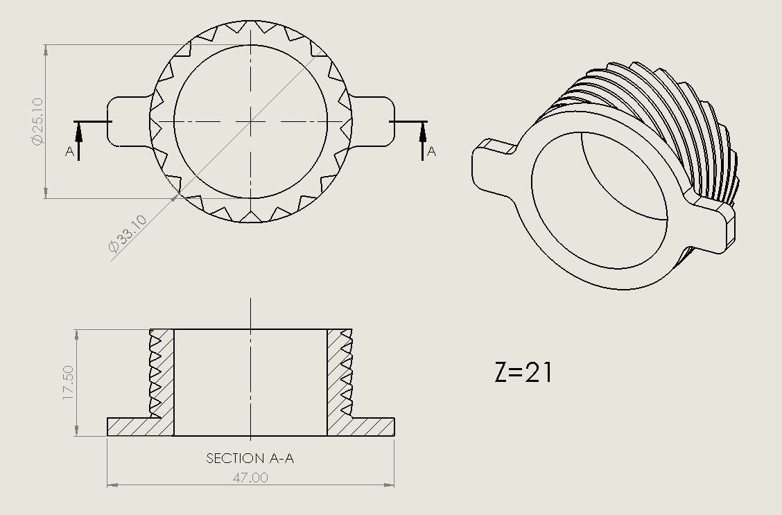 Please note that there is an issue with the original speedo on this model - the outside diameter of the gear is too small which results in quick wear of the teeth. I have sorted that issue by making the gear larger so it contacts the steel gear properly. The drawing I put here is for the original speedo so that you can compare. The one that I ship though is slightly bigger on the outside diameter.